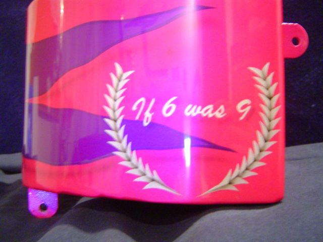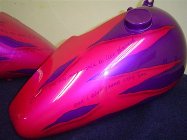 This Jimi Hendrix inspired FLH Harley belongs to ED of Dayton, Ohio. The complete bike including frame is done in hot pink pearl, and passion pearl. Check back this spring for assembled pictures.