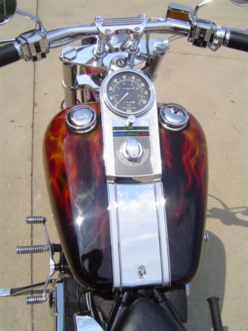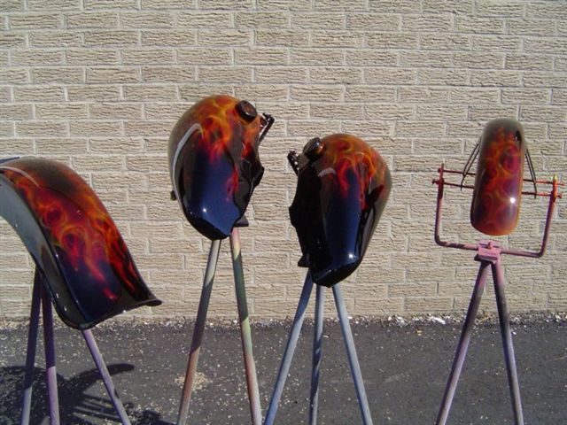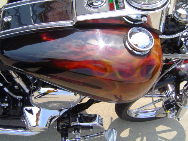 Dave Garner of Dayton, Ohio will be heating up the streets on his custom painted True Fire Harley Davidson. Be sure to check out Dave's out law class Katana here. Colors used: House of Kolor: Black, Molly Orange, Chrome Yellow Kandies: Red, Tangerine, Pagan Gold, Passion Pearl |