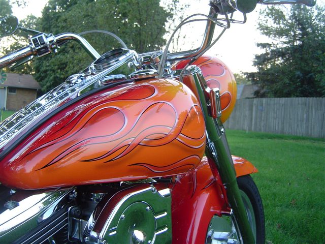 Todd's fatboy. New and improved! Original paintwork in 1996. Refreshed rear fender. Original 1929 model A ford headlight ( pretty cool -huh?).